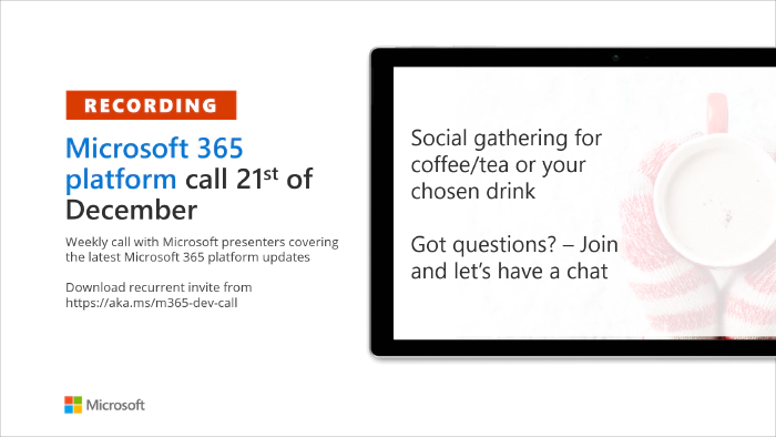 Microsoft 365 platform call – December 28that 8:00 am PST | https://aka.ms/m365-dev-call