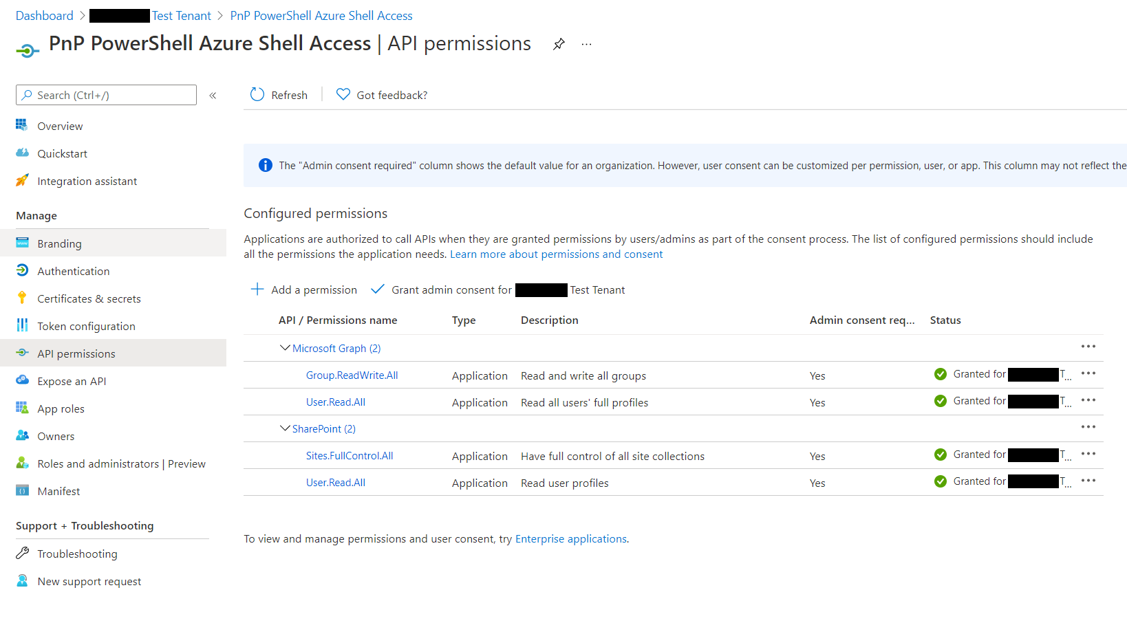 - PnP Management Shell – the multi-tenant app PnP provides – this uses DELEGATE permissions meaning the connection will need to log in as the user and will only have access to services THE user has access to. If you need clarification on the difference between the types of permissions, I highly recommend checking out an awesome community call demo from Philippe Signoret, Program Manager of the Microsoft Identity team: https://youtu.be/_BfI4L7j1Po So why are use an Azure AD app? Using the Azure Shell restricts some authentication options when connecting to services with PnP PowerShell, such as interactive login, because it cannot display a pop-up window.