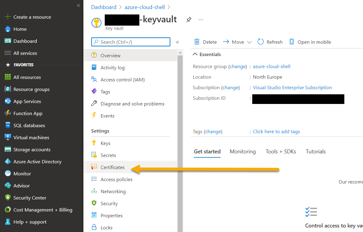 Now that we have the app setup, we need to upload the certificate to the KeyVault. Navigate to the KeyVault in the portal