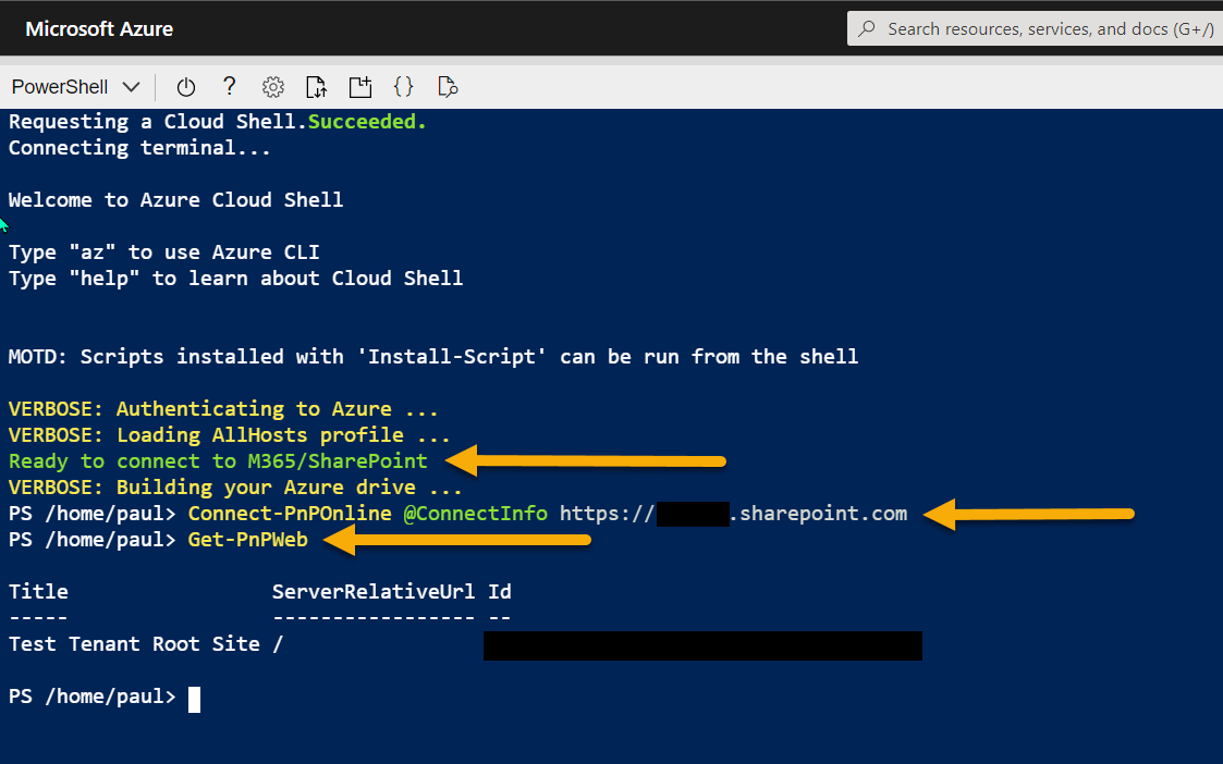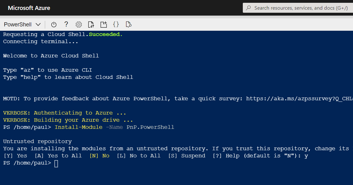 Next, we need to install the PnP PowerShell module in Azure Cloud shell, enter: