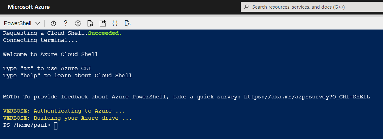 First, let’s go ahead and activate the Azure Shell; we will use this to set up the required resources as well: Navigate to https://shell.azure.com or select the icon in the Azure Portal.
