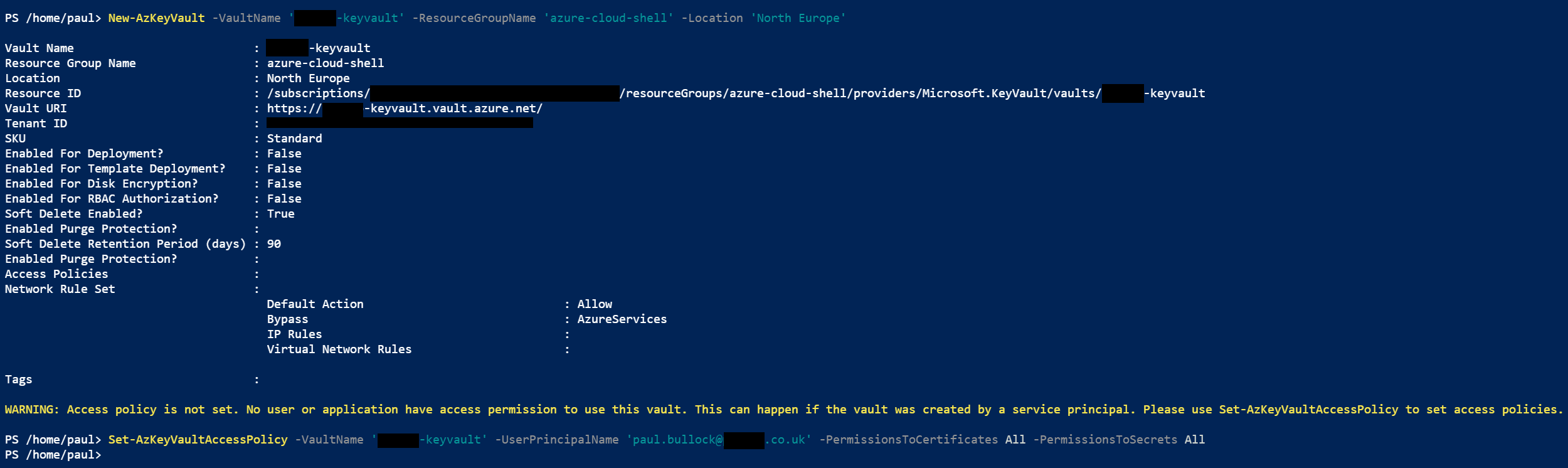 New-AzKeyVault -VaultName 'pkbtenant-keyvault' -ResourceGroupName 'azure-cloud-shell' -Location 'North Europe'