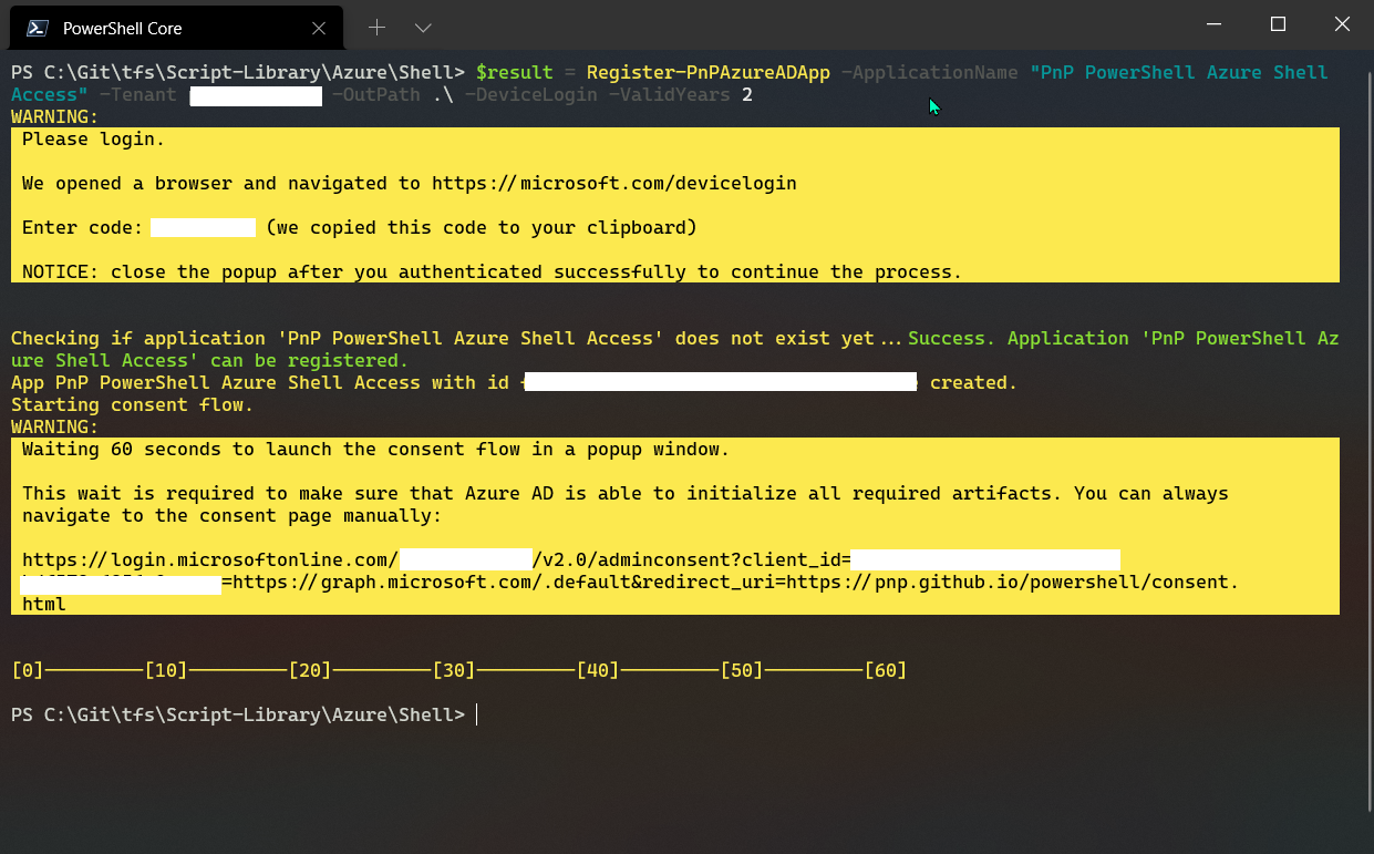 $result = Register-PnPAzureADApp -ApplicationName "PnP PowerShell Azure Shell Access" -Tenant yourtenant.co.uk -OutPath .\ -DeviceLogin -ValidYears 2 -CertificatePassword (ConvertTo-SecureString -String "yourpassword" -AsPlainText -Force)