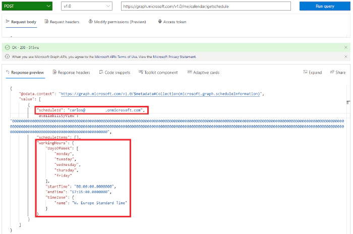 By using the calendar/getSchedule action it is possible to get not only the user’s free/busy schedule but also the working hours and time zone for any user in the tenant, using delegated permissions in Microsoft Graph. To use this action we need to do a post request to one of the following graph endpoints: