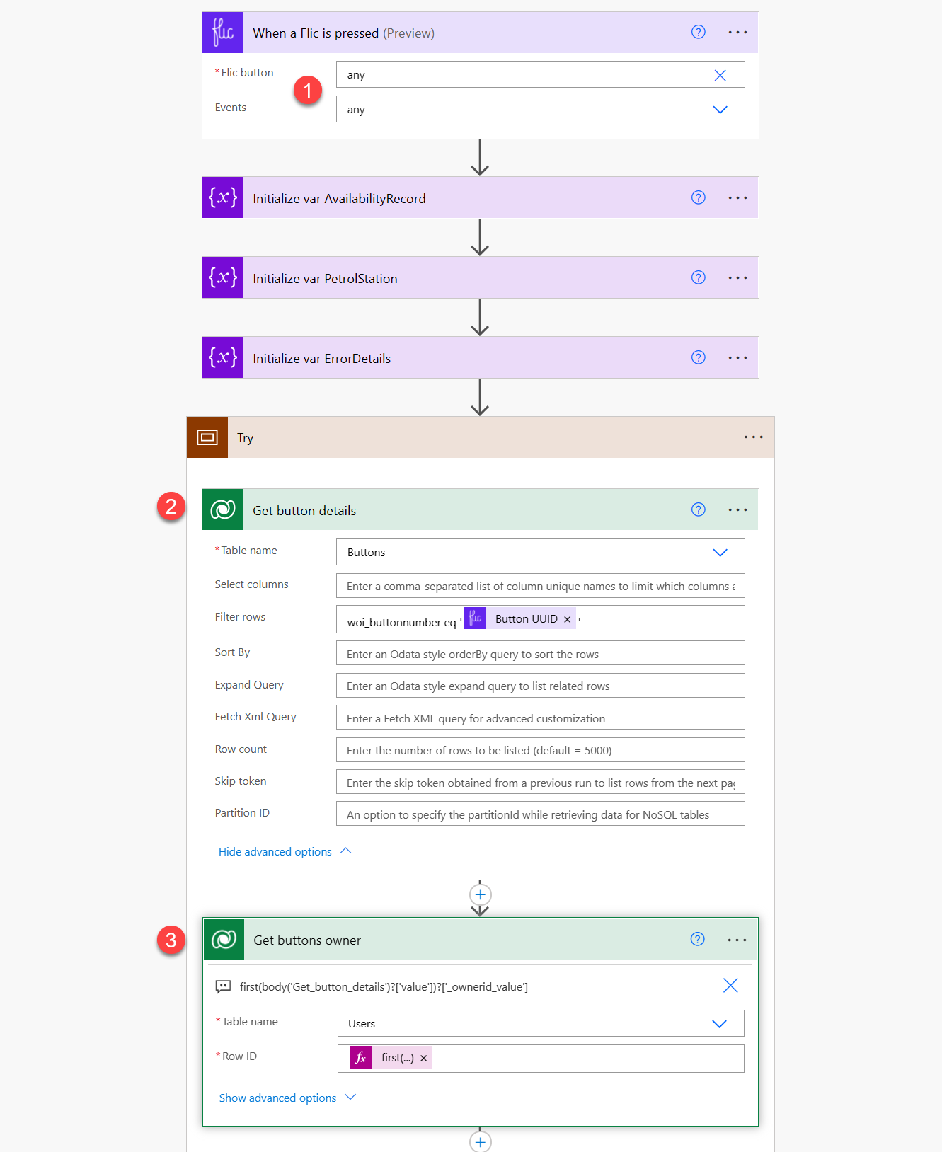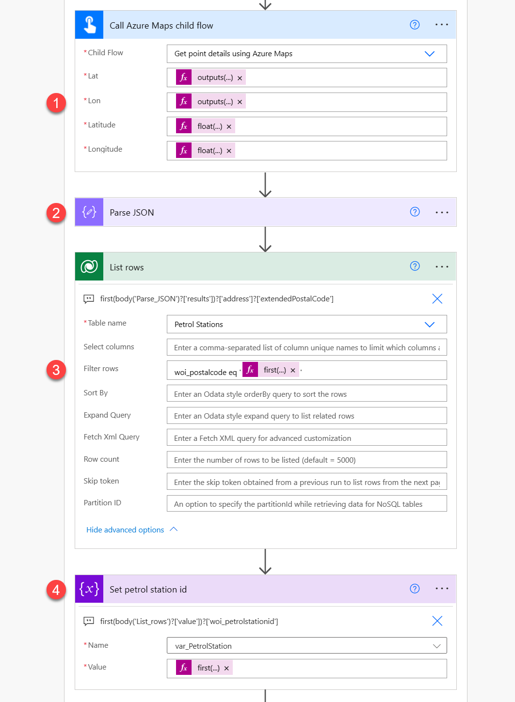In a big picture, the flow was built to get information about location of a driver who triggered it, next to lookup details of the closest petrol station (by using Azure Maps API). Finally to save the station’s data together with status into database, so later it can be displayed with a proper color of a pin, inside the app. But in details, it’s much more interesting.