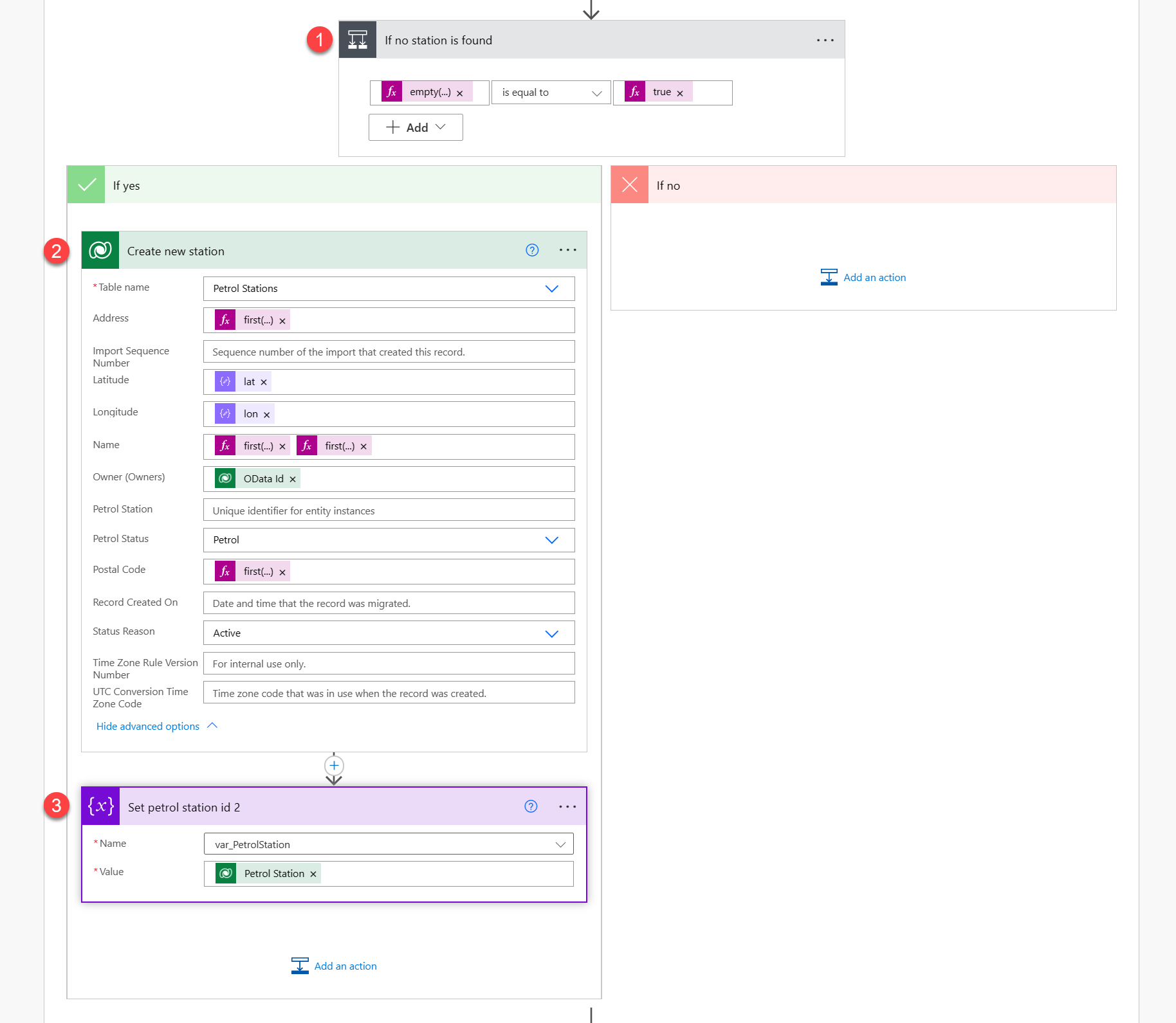 Process now checks, if station’s row ID is empty (1) - if yes, it means it has to be created. Creation (2) of the record takes all the details returned from Azure Maps API, like full address, station name, lat and lon, information about driver who reported it and finally - the postal code. After that row ID of the created station is being saved into variable.