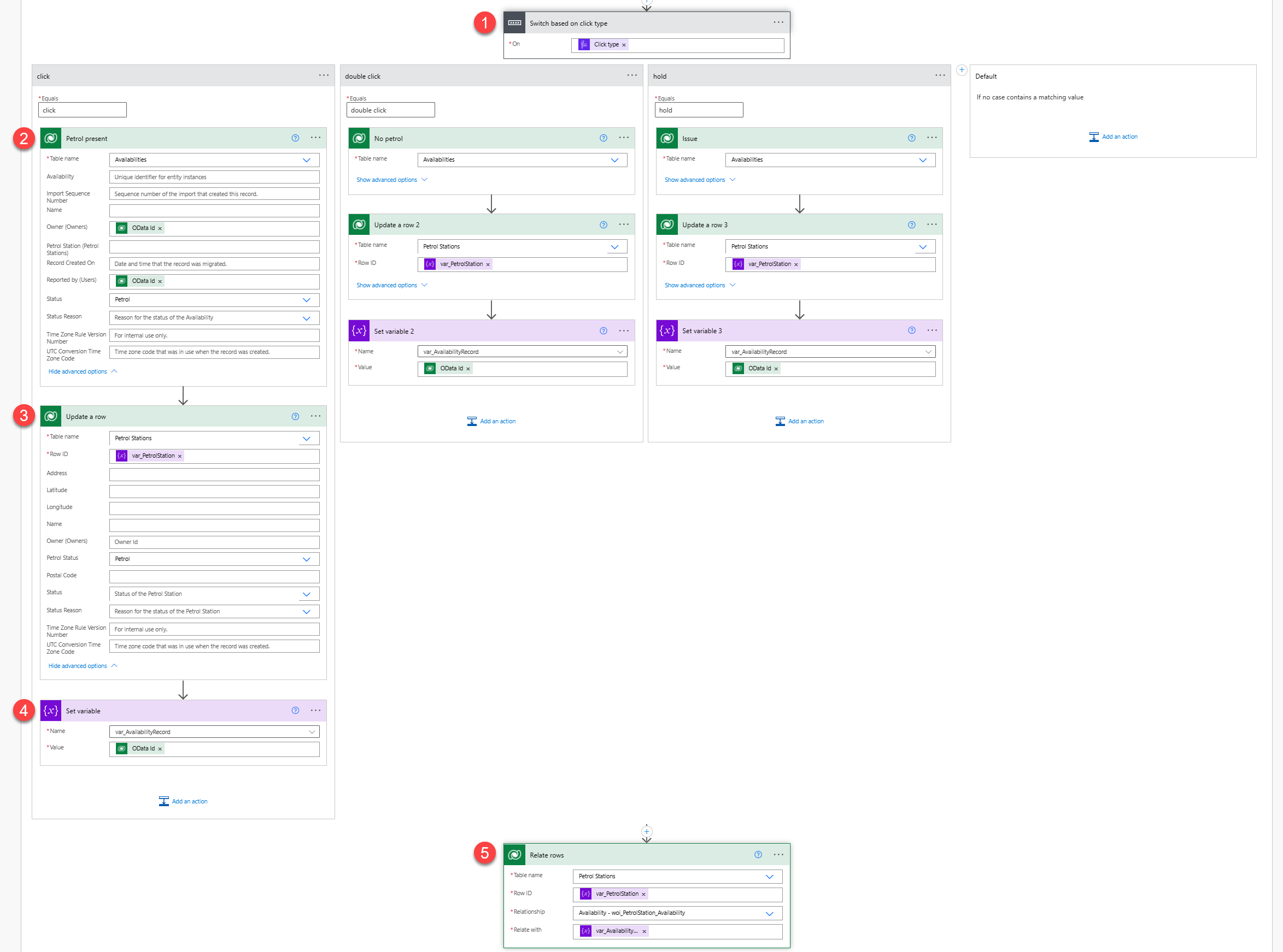 To check what action occurred, we are using switch action (1). For each branch process executes the same actions, just with different statuses. First, bot creates an entry in Activities table (2), to record latest status (to one from Petrol, No petrol, Issue) for the station together with driver details who reported it.