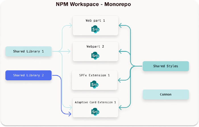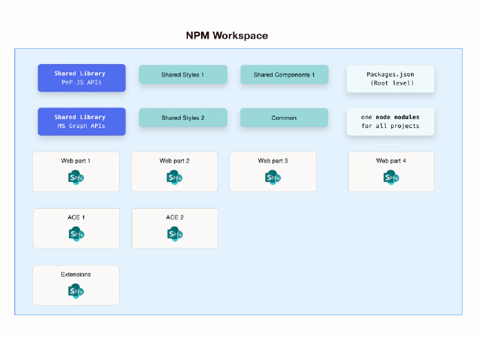 Scalable and modular for large teams – NPM Workspaces allow multiple SPFx projects to share code efficiently while remaining independent, making collaboration easier across large development teams. As projects grow, this structure ensures maintainability, reduces redundancy, and streamlines updates.