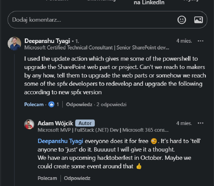 During the event, some amazing achievements were made but also some really awesome stories were born. It’s impossible to mention it all but let’s look at the issue to upgrade RSS Reader web part. This is a perfect example of how the community will try to help each other move toward a common goal. Upgrading this SPFx project did prove very problematic and what we noticed is that the community just kicked off helping each other, providing feed, and even sharing work 👏. This is a true power of open-source and community ❤️.