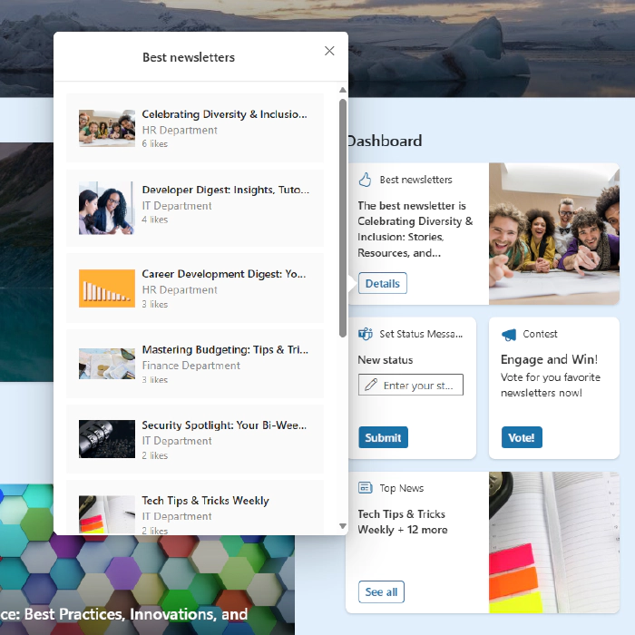 On the intranet home page, the Viva Connections Dashboard features a custom adaptive card extension developed using the SharePoint Framework. This extension shows newsletters from all department sites and organizes the retrieved pages based on the number of likes.