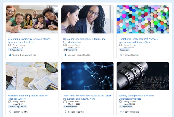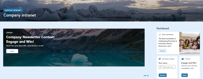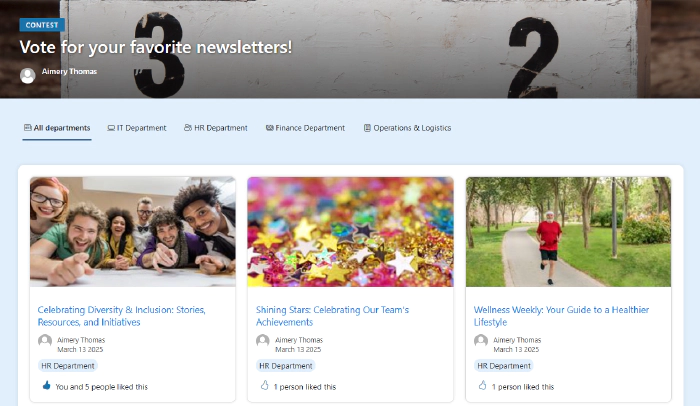 There are 4 department sites associated to the hub. Each department site is a standard SharePoint communication site where contributors can create newsletters (SharePoint news) that will be available for the voting contest. It is recommended that the news contains a banner image so it is displayed nicely on the voting page.
