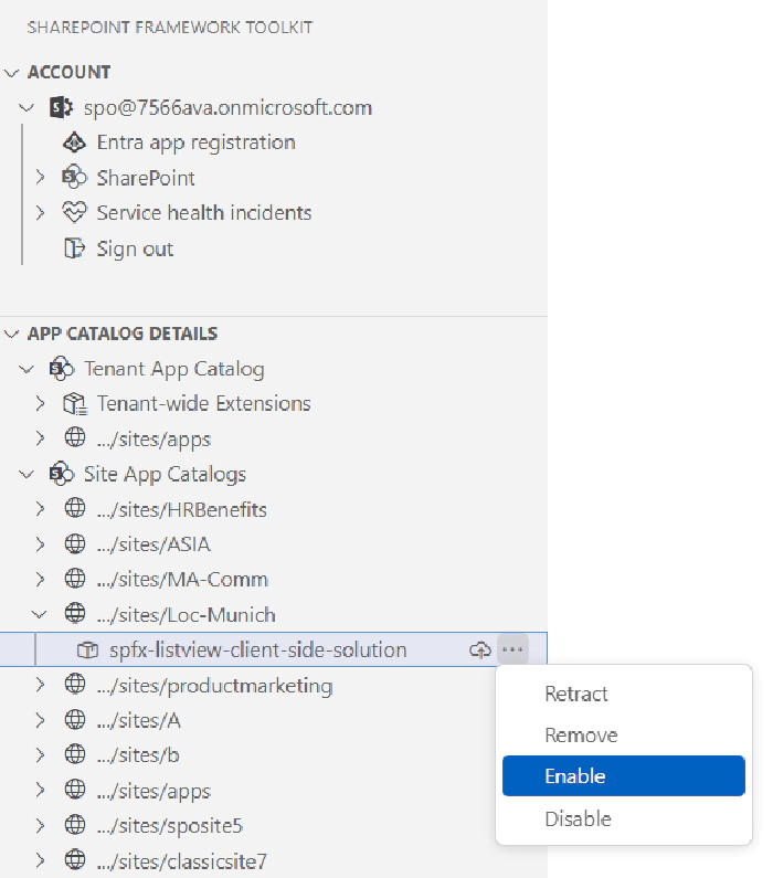 Staying in the flow of your work is extremely important and context-switching is just a waste of time. That is why in this release we extended the management capabilities of this extension. Now after successfully signing into your tenant, you will not only see all app catalogs you have on your tenant but also all solutions deployed to every app catalog providing you quick links to redirect to them. But wait there is more! We also give you actions for each SPFx app to deploy, retract, enable, disable and even remove a solution directly from VS Code 🤯