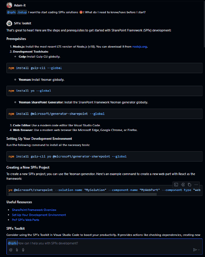 The repolished /setup command now gives you a totally new experience allowing you to start your journey with SharePoint Framework development. It will give you very accurate answers on how to get started with SPFx development and how to prep your local workspace to be ready to go 🚀
