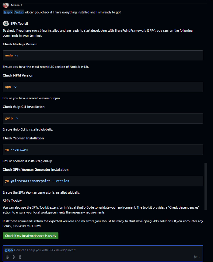 When asked about validating if your local workspace is ready to start coding, so basically asking if you have everything properly installed, you will get an action that will run the SPFx Toolkit validate action that scans your local workspace and checks if you have all required dependencies properly set and if not it will install them for you 😮.