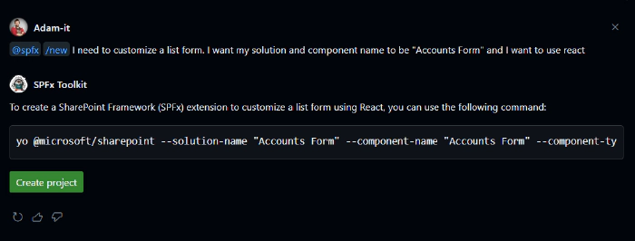 You may also be very accurate in what you want and SPFx will understand your needs and will setup the correct SPFx generator command for your prompt. BTW you may also ask it about a sample for your case and SPFx Copilot chat participant will give you an action to open up the sample gallery 🤯