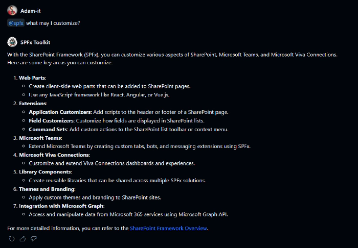 But it’s not only about grounding. SPFx Toolkit Copilot chat participant gives you unique commands that are preconfigured towards a specific scenario: